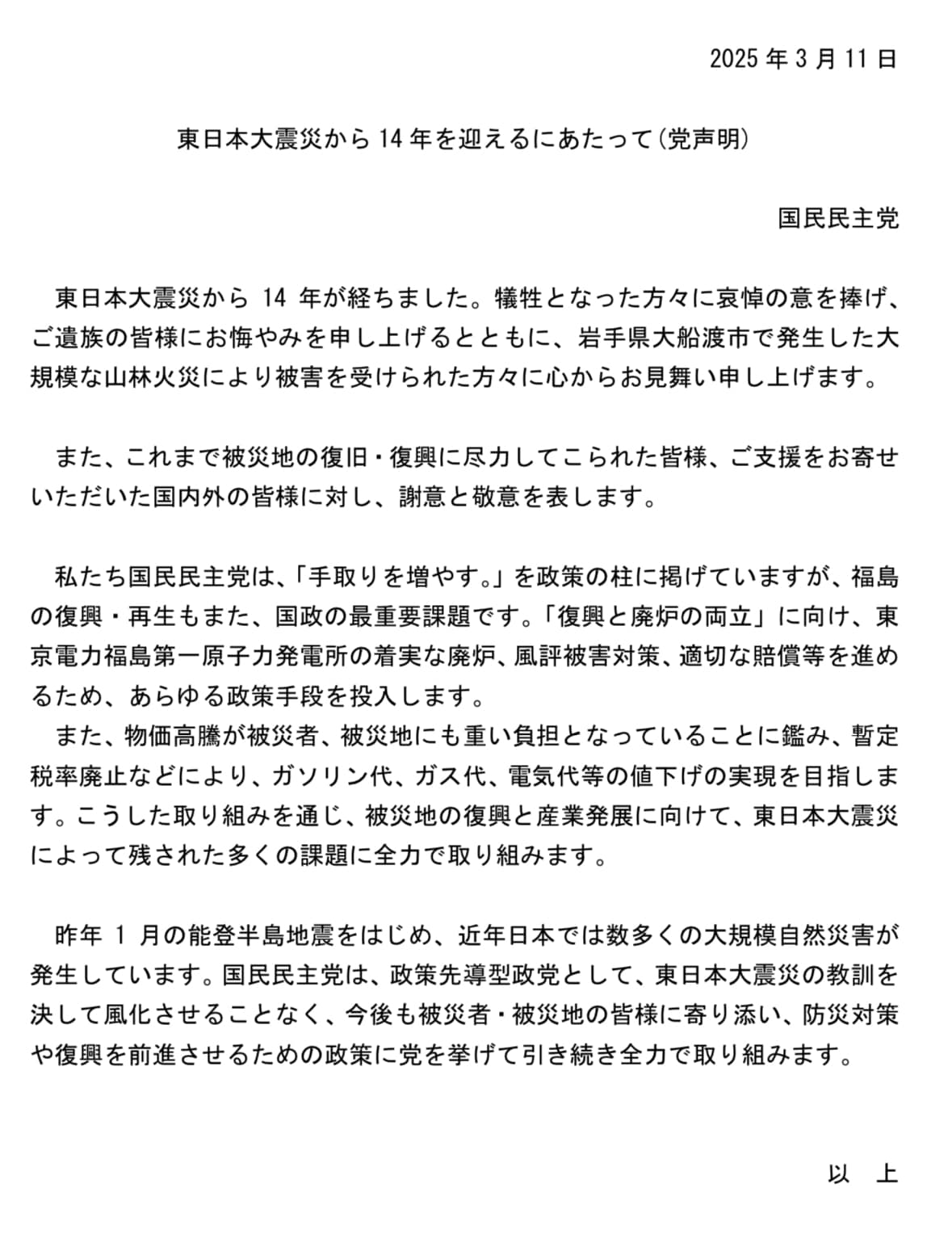 2025年3月11日(火)、東日本大震災から14年を迎えました。午前中に開かれた内閣委員会で黙祷を捧げるとともに地震が発生した午後2時46分には事務所全員で黙祷し、亡くなられた方々のご冥福をお祈りしました。
