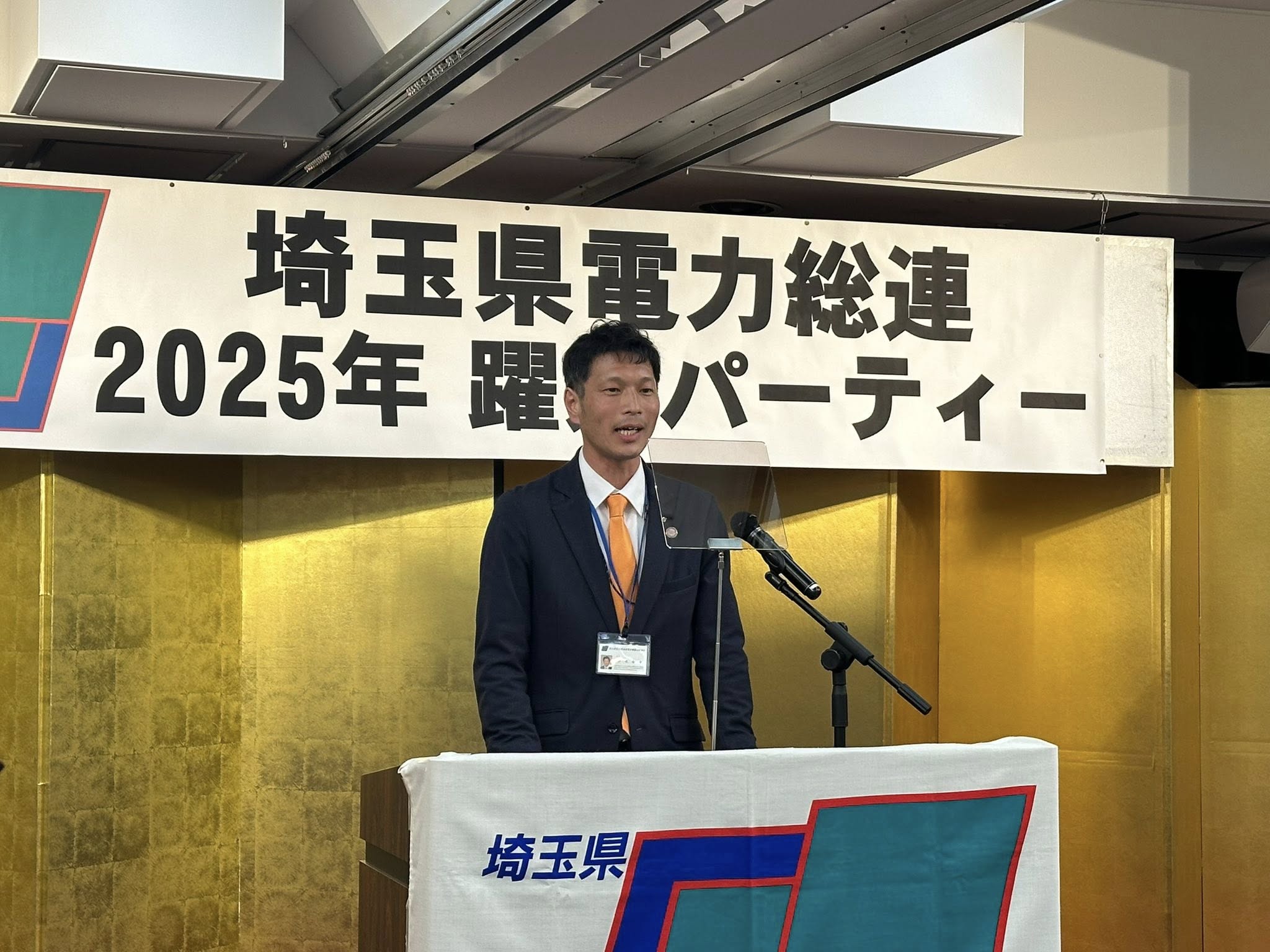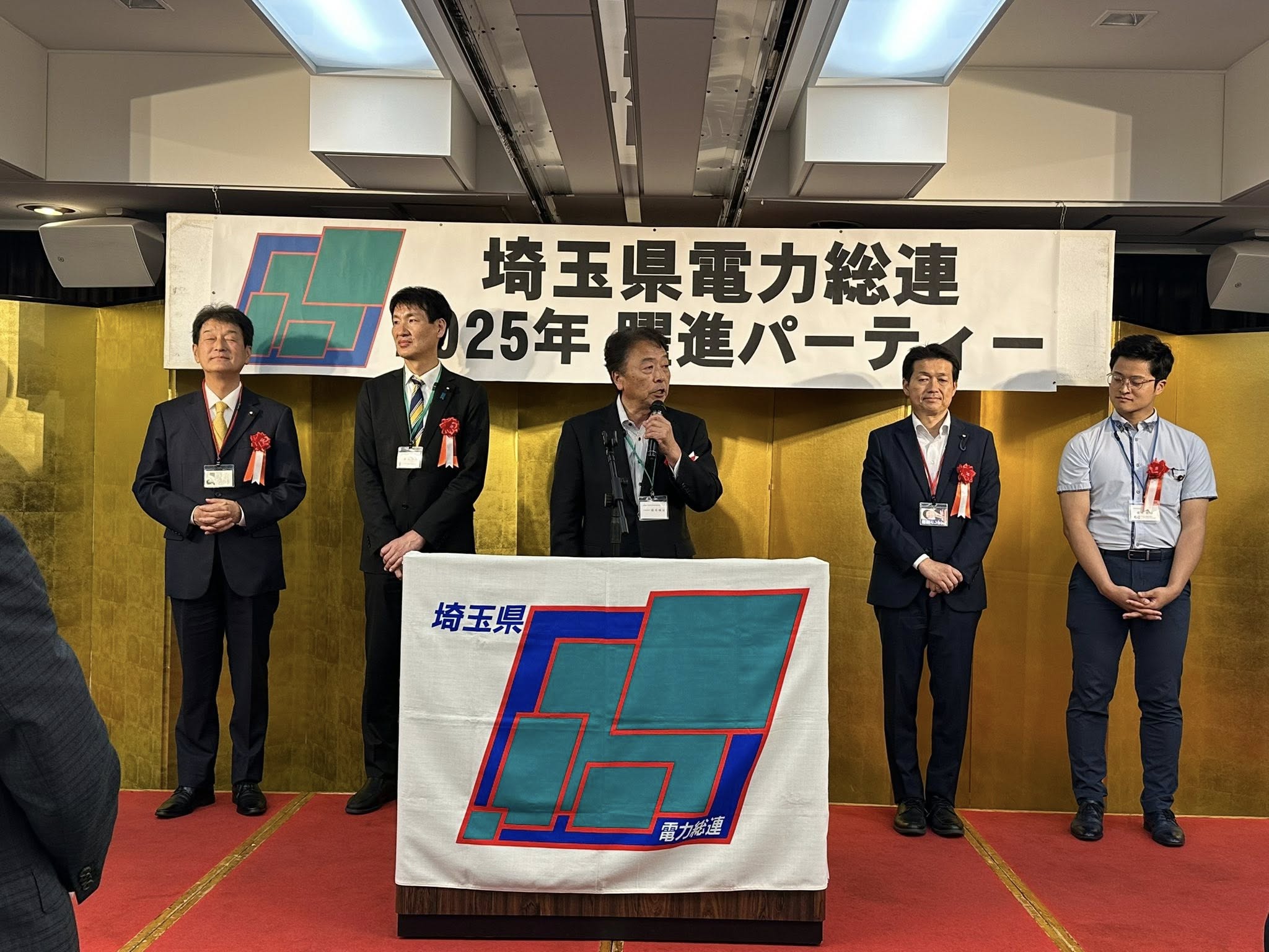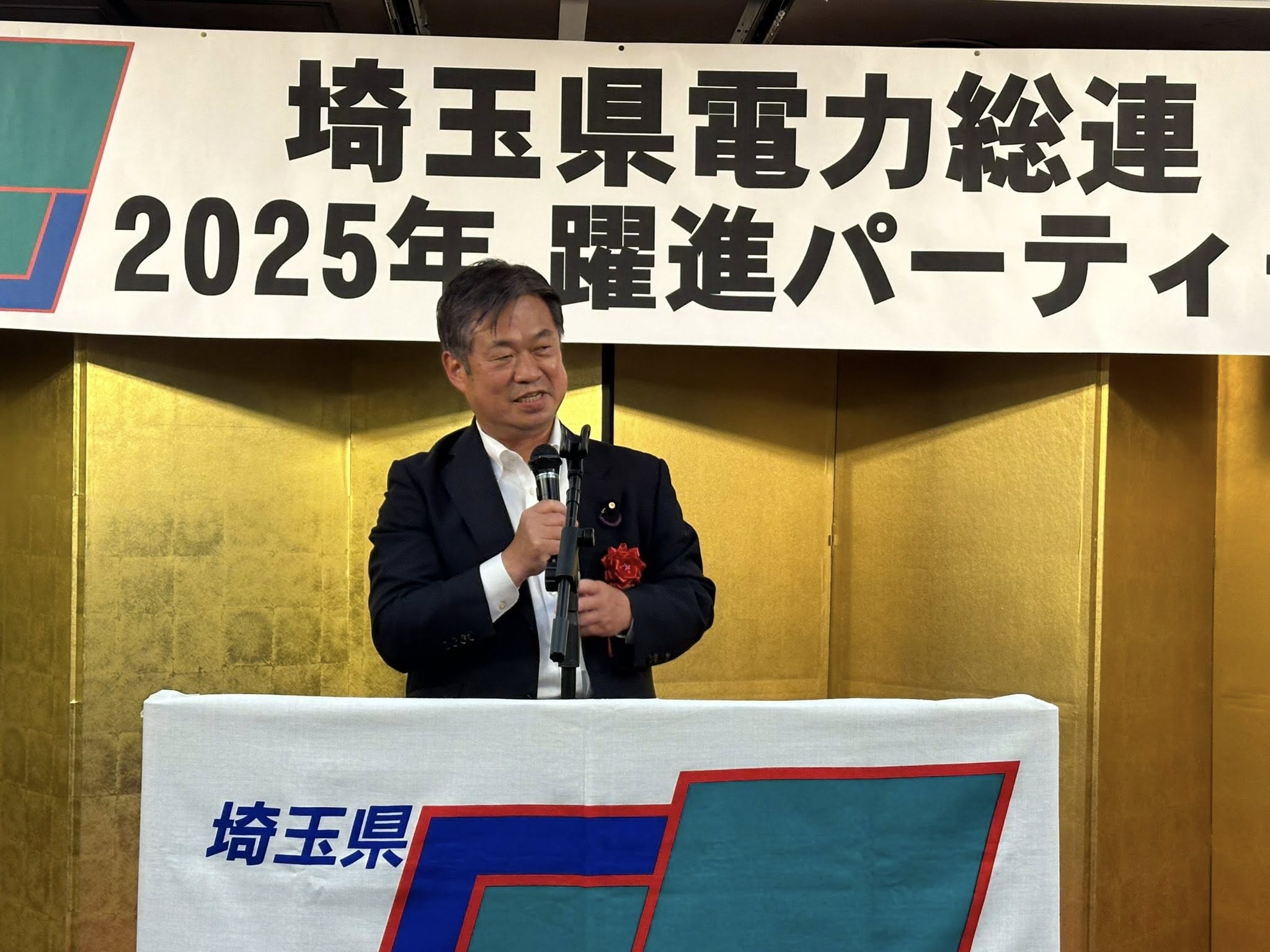国政報告会の後は同会場において埼玉県電力総連2025年躍進パーティーが開催され、私も出席させていただきました。国民民主党埼玉県連所属の国会議員、自治体議員をはじめ同県連の推薦議員、連合埼玉の仲間の皆さま、電力関連産業労使の代表者など150名を超える方々が集まり、今夏の参議院選挙にむけて比例代表は浜野よしふみ議員、埼玉選挙区では江原くみこ氏の必勝を誓い合いました。