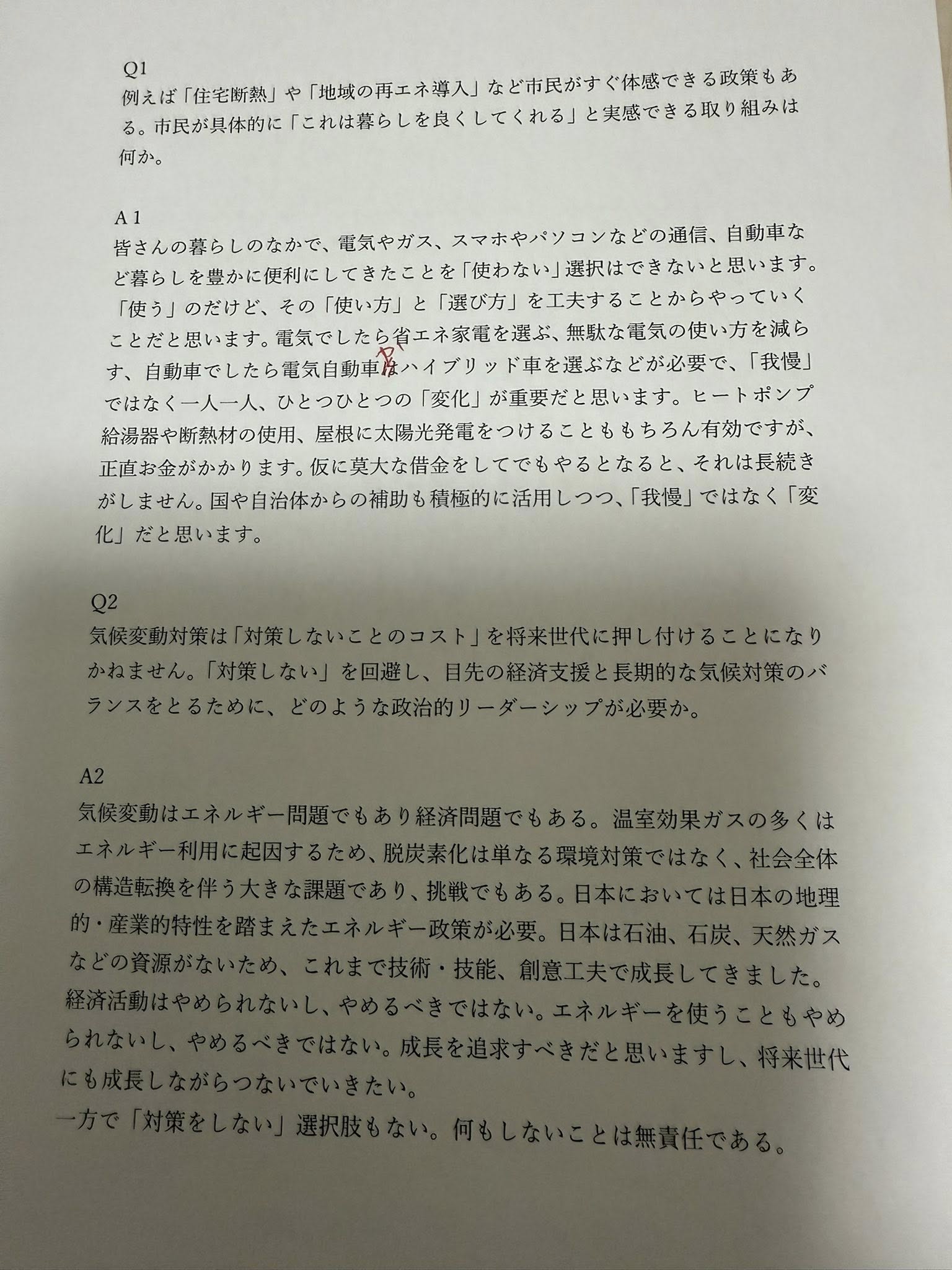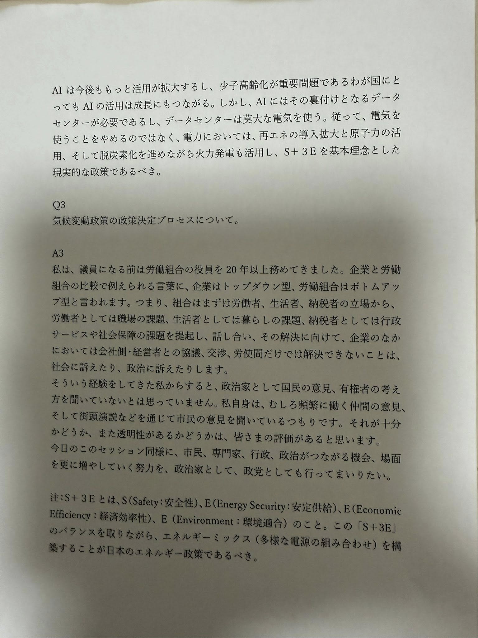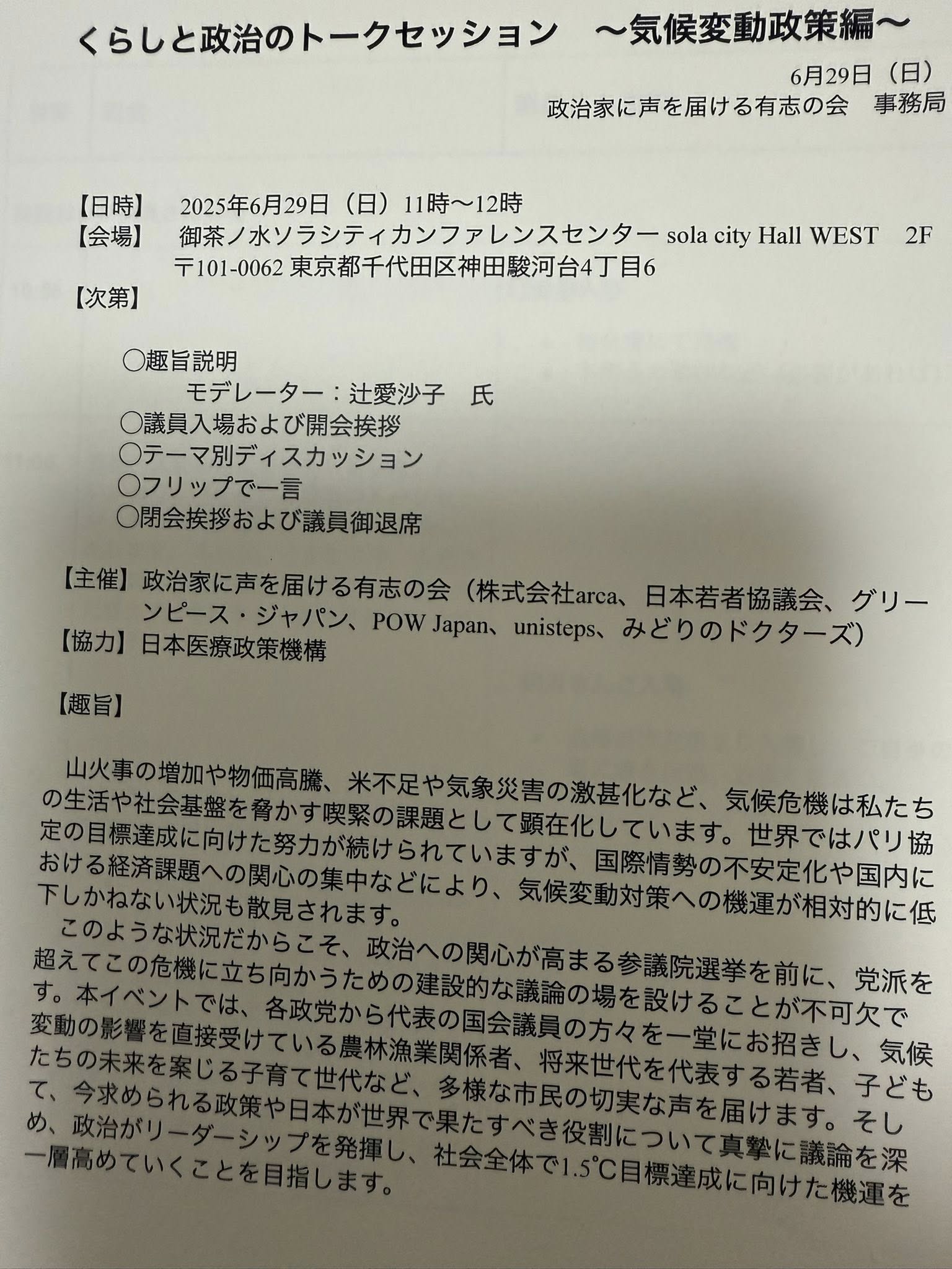 2025/06/30 くらしと政治のトークセッション参加 2025年6月29日(日)、政治家に声を届ける有志の会の「くらしと政治のトークセッション〜気候変動政策編〜」に国民民主党エネルギー調査会事務局長として参加しました。日本の地理的特性、産業的特性を踏まえたエネルギー政策が必要。偏らない・現実的な政策、「我慢」より「変化」を主張しました。1問1分半という時間設定があったので、要点を簡潔に伝えられるよう予めペーパーを用意して登壇しましたが、私の想いが伝わっていれば幸いです。 « 前の記事へ 次の記事へ »