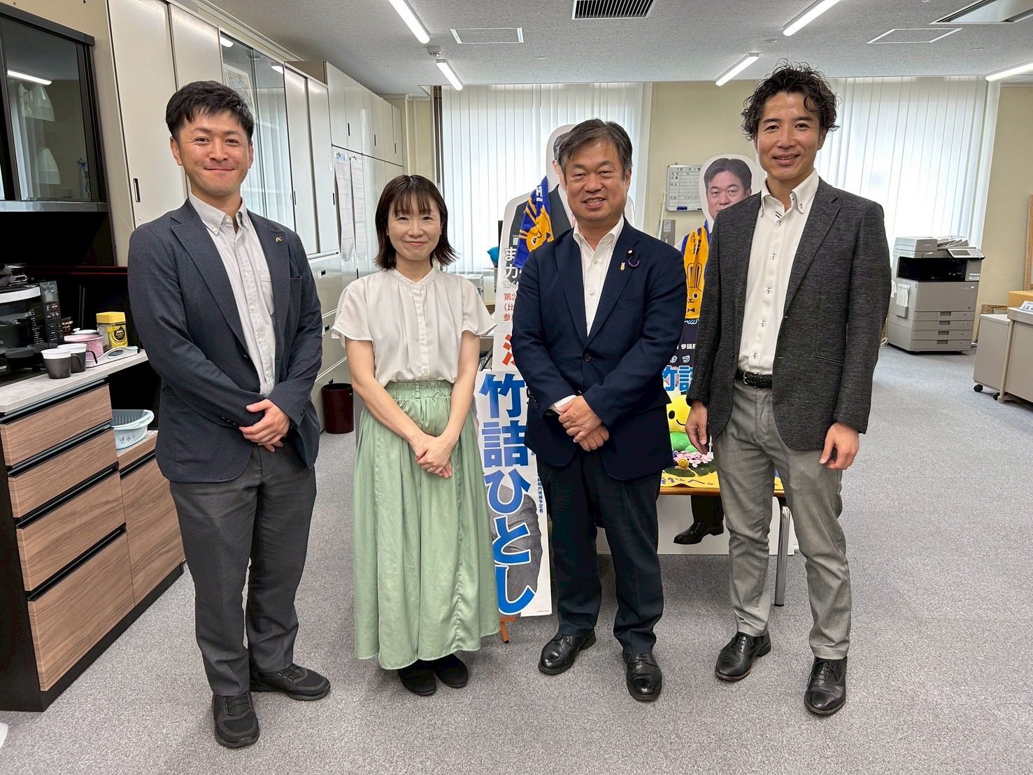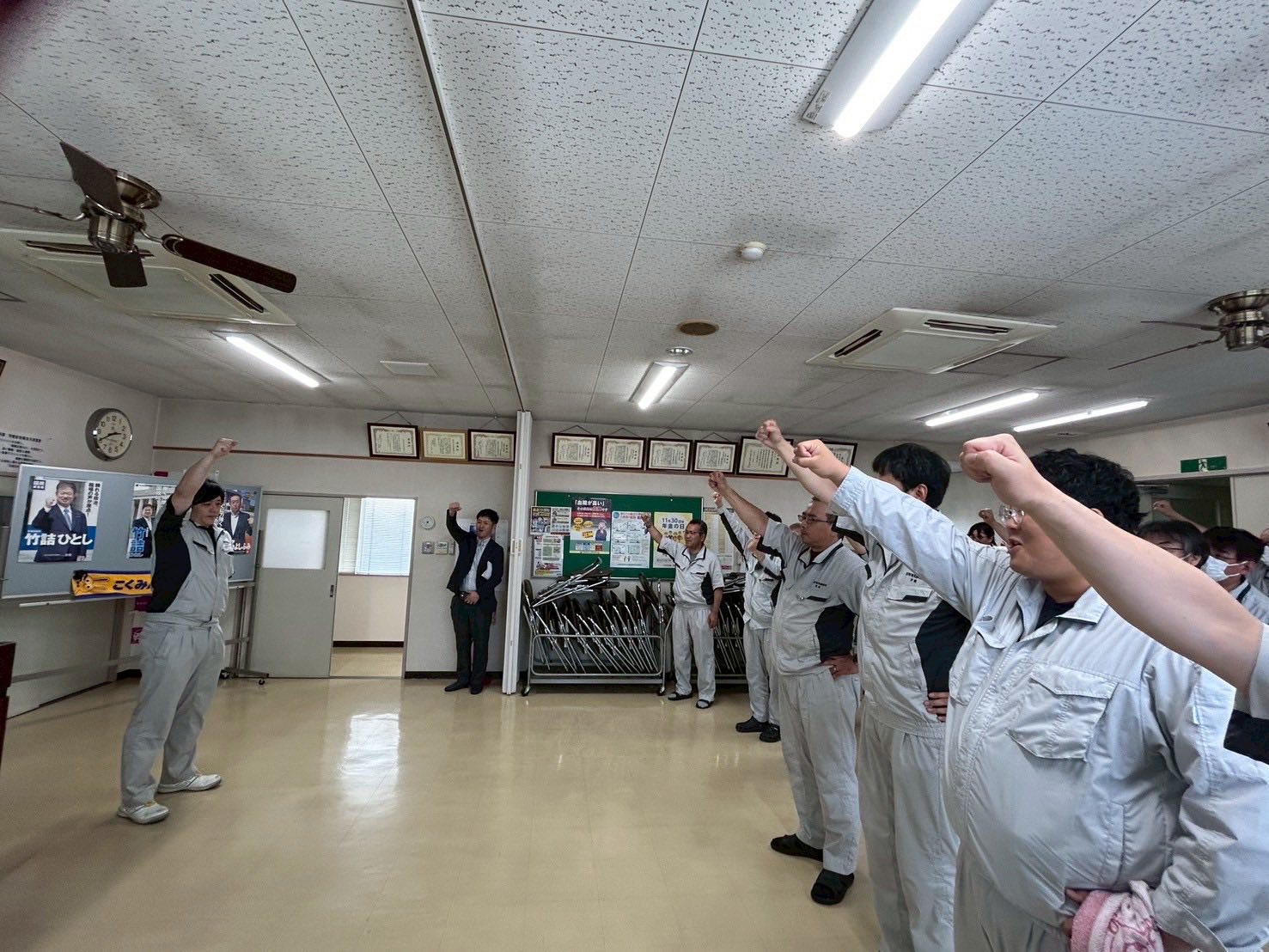 はが道也 事務所を激励訪問。がんばろう三唱を行いました。事務所の皆さまから大歓迎をうけ大変、嬉しかったです。最後まで共に頑張りましょう!
