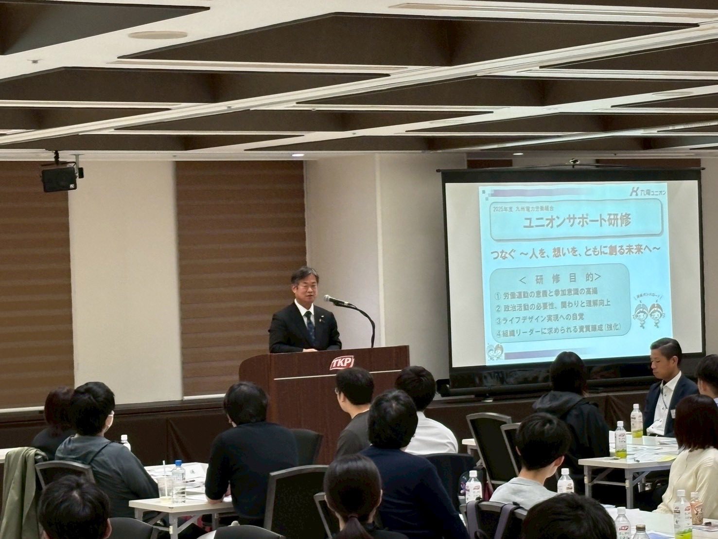 2025年10月31日(金)、九州電力労働組合ユニオンサポート研修(@福岡・TKPガーデンシティ天神)で国政報告をさせていただきました。この研修は29-30歳の組合員を対象としており、各職場で中堅の役割を担い、また将来の電気事業を支える要の皆さまです。国政においてはエネルギーや電力関連産業にかかわる法案審議や政策論議が頻繁に行われております。国政で議論が繰り返されるほど、電気事業は重要かつ不可欠な事業であり、これからも安定供給やカーボンニュートラルを担う誇りを持ち続けていただきたいと思います。そして私は職場の課題や組合員の皆さんの生の声を国政に届けてまいります。